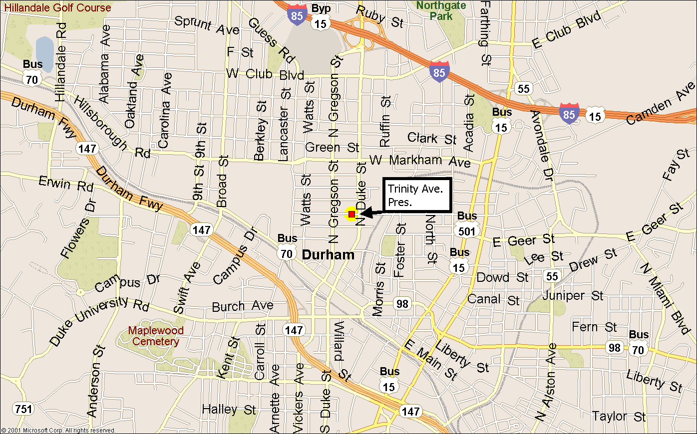 From Points West: Get on I40/85 E Take I85 (left) when I40 & I85 split Take exit 17A (Gregson St.) Bear right onto Gregson Turn left onto Trinity Ave. | From Points East: Get on I40 W Merge onto HWY 147N via Exit 279B Take Exit 12C (Duke St.) Turn right off the exit onto Duke St. Turn left onto Trinity Ave. |